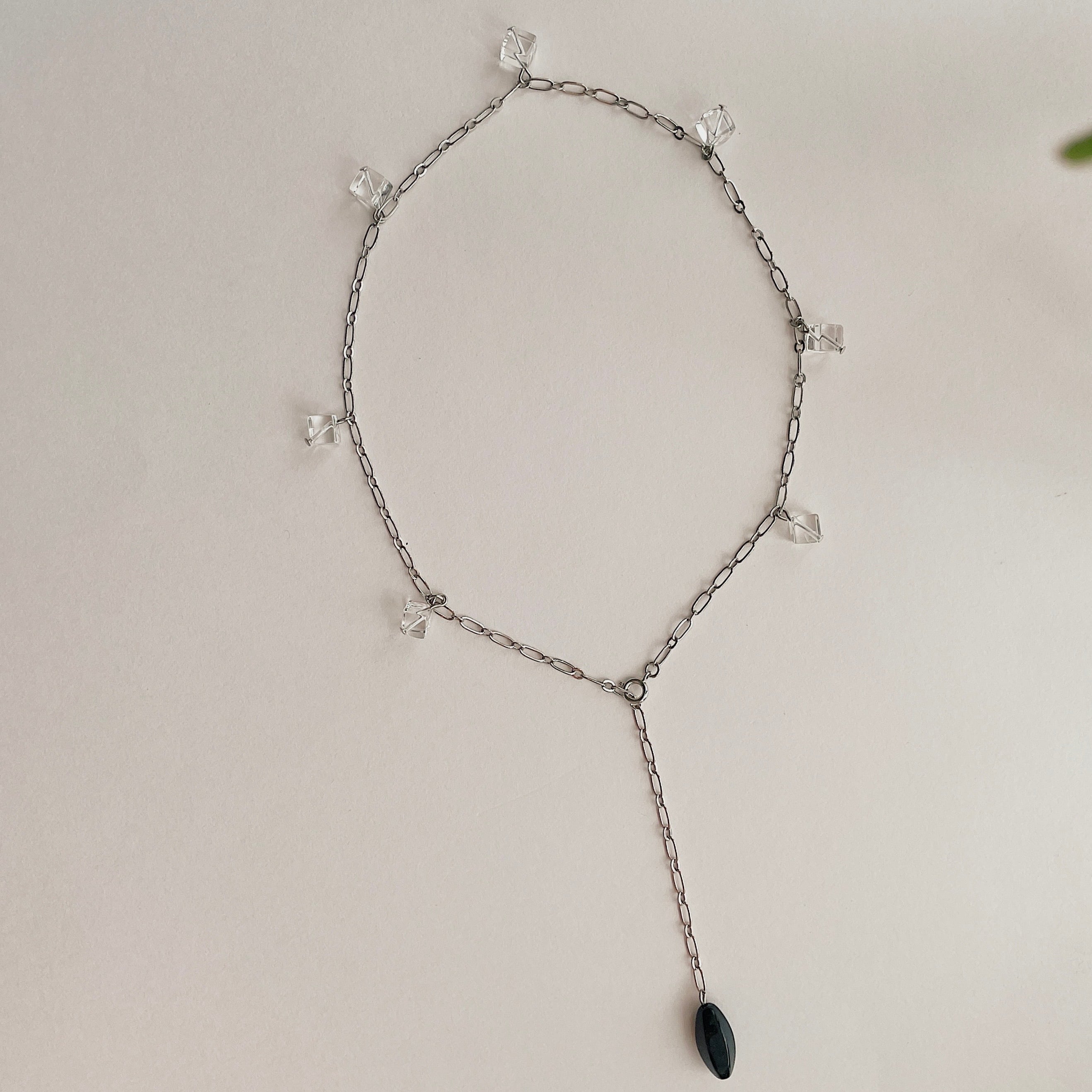 スクエアの水晶を使用したチェーンのネックレス。チェーンの先にあるオニキスがアクセントになり、様々な着用方法をお楽しみいただけます。