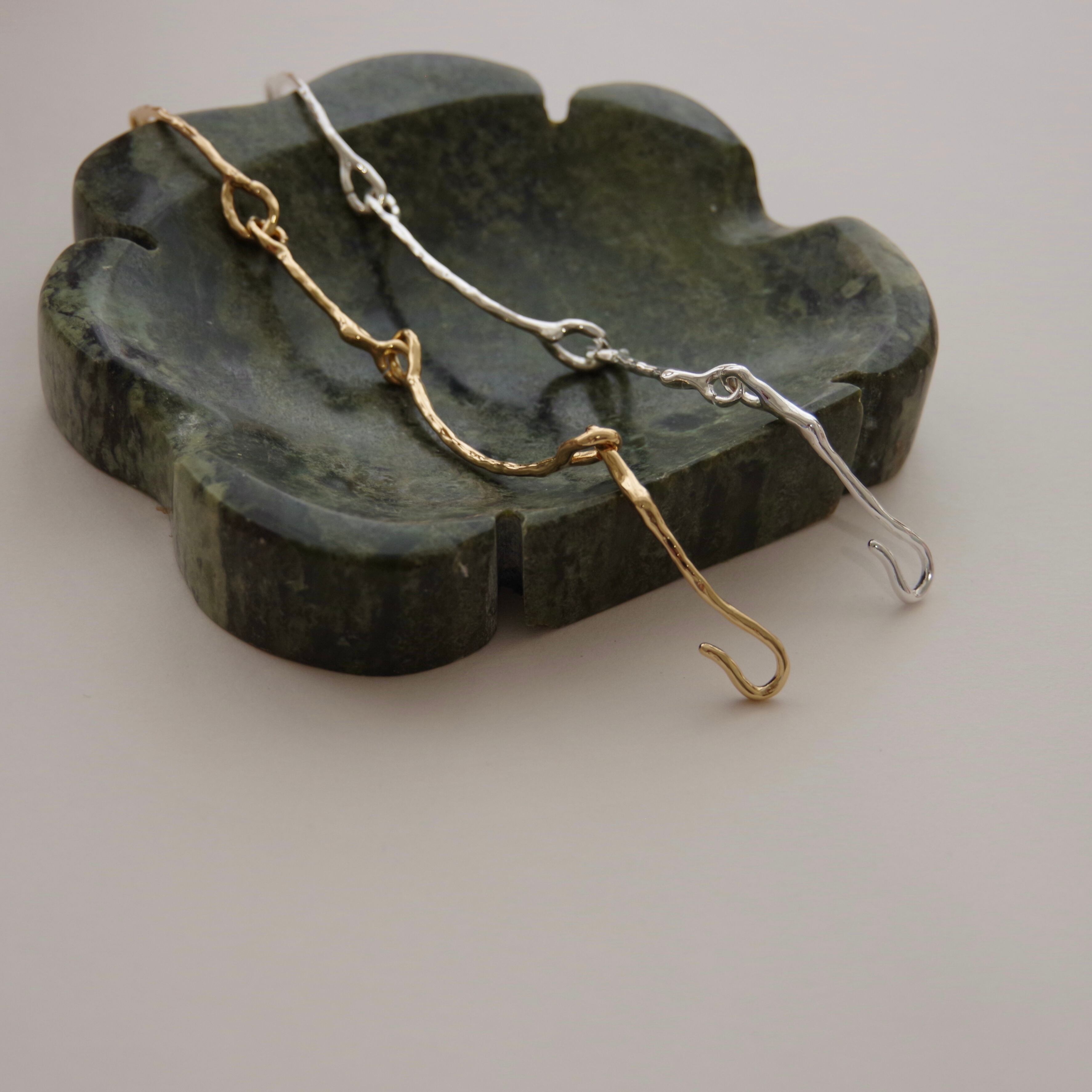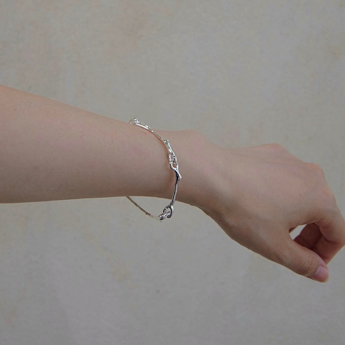 歪にデザインされた華奢なパーツを繋ぎ合わせたブレスレットです。 ゴールド・シルバーの2色からお選びいただけます。 真鍮に18K・silver925のコーティング素材の為、錆びにくくアレルギーにも対応しています。 ※複数購入のお客様は基本同梱させていただきます。別梱包をご希望の場合は備考欄へご記入ください。 <サイズ> 約17cm <素材> 真鍮 <コーティング> silver925/18K